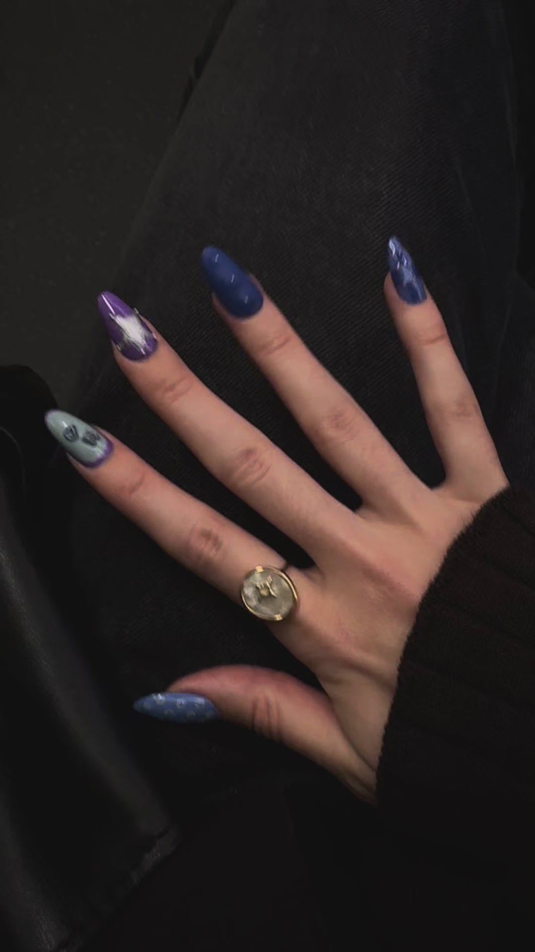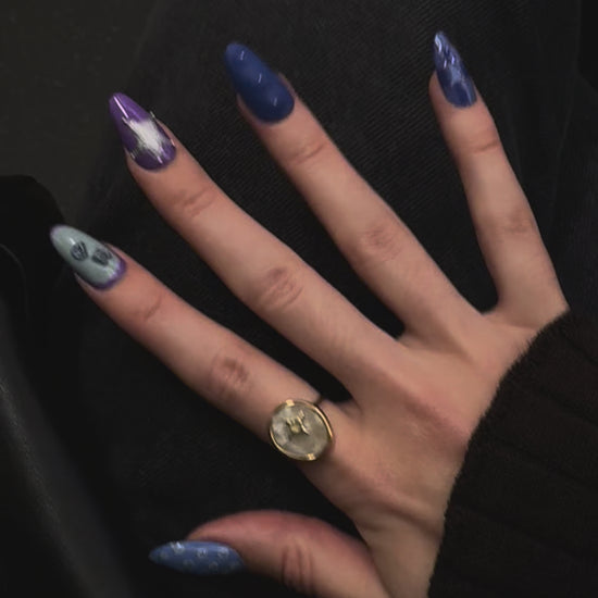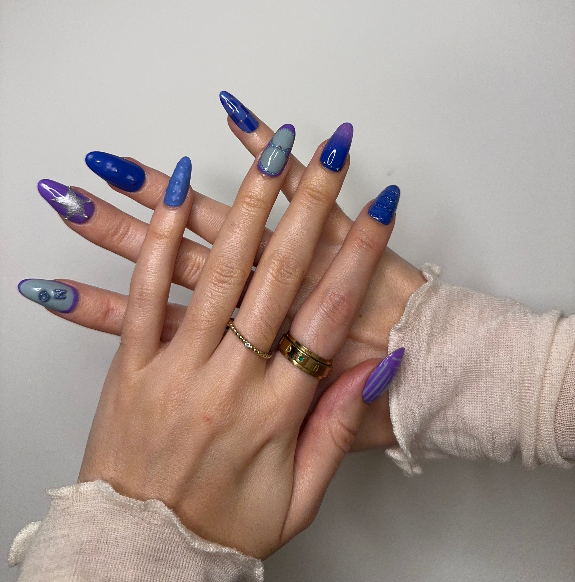 Spiky Strawberry™ Blue Star is a design that draws inspiration from starry nights and cosmic vibes, this nail set blends deep purples, electric blues, and shimmering glitter with metallic accents, and 3D embellishments.
