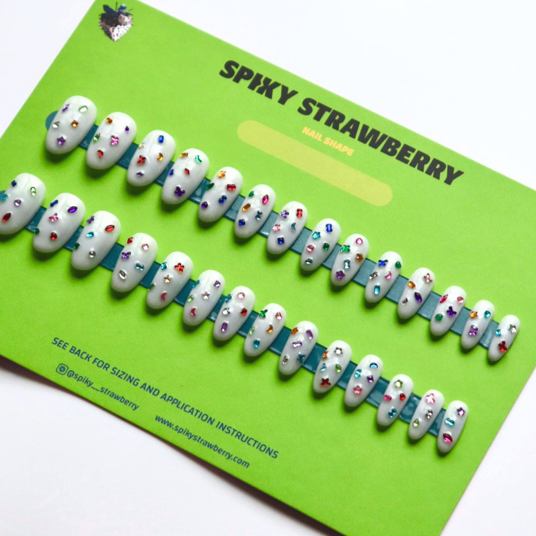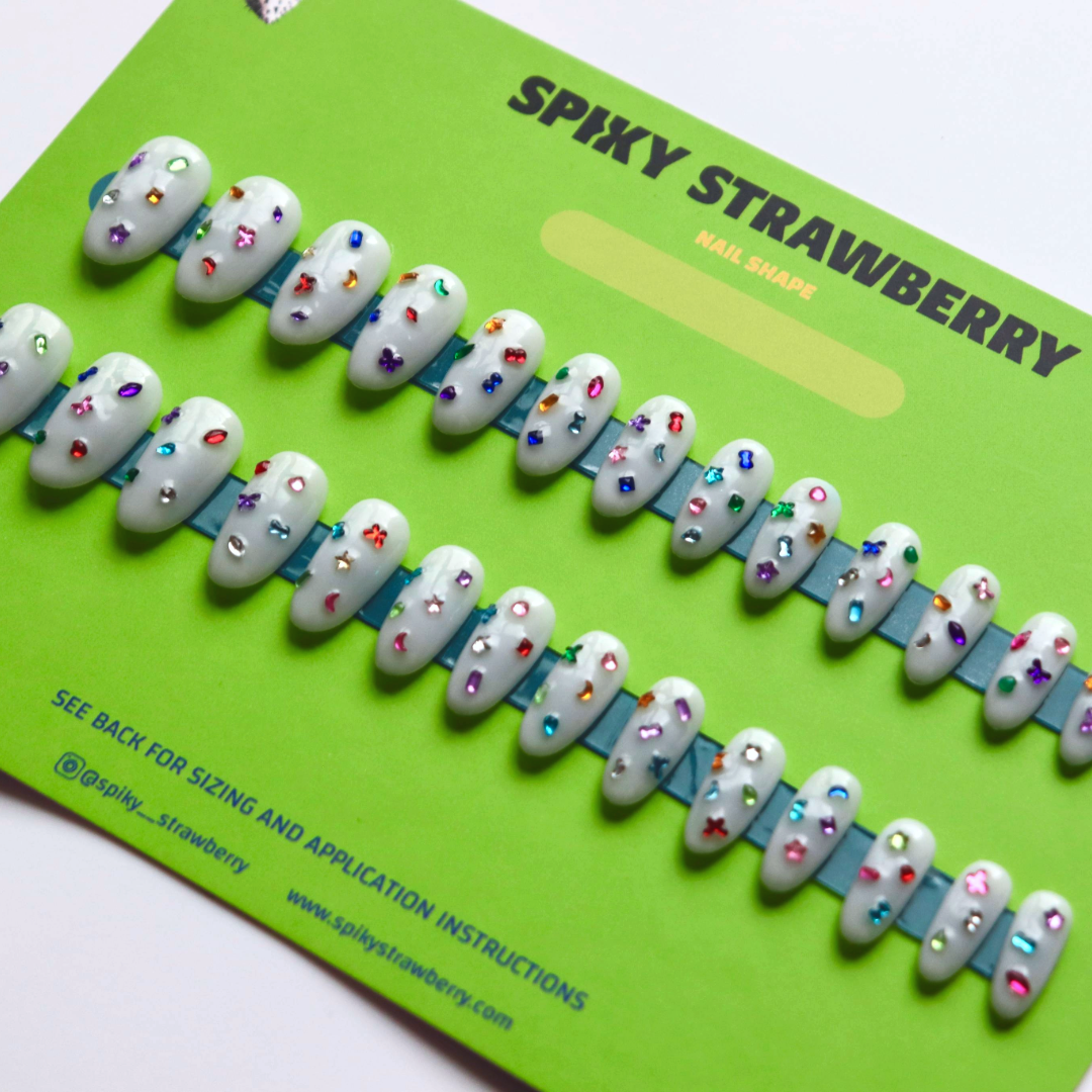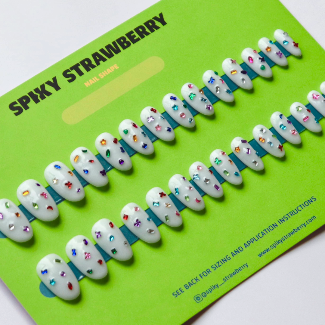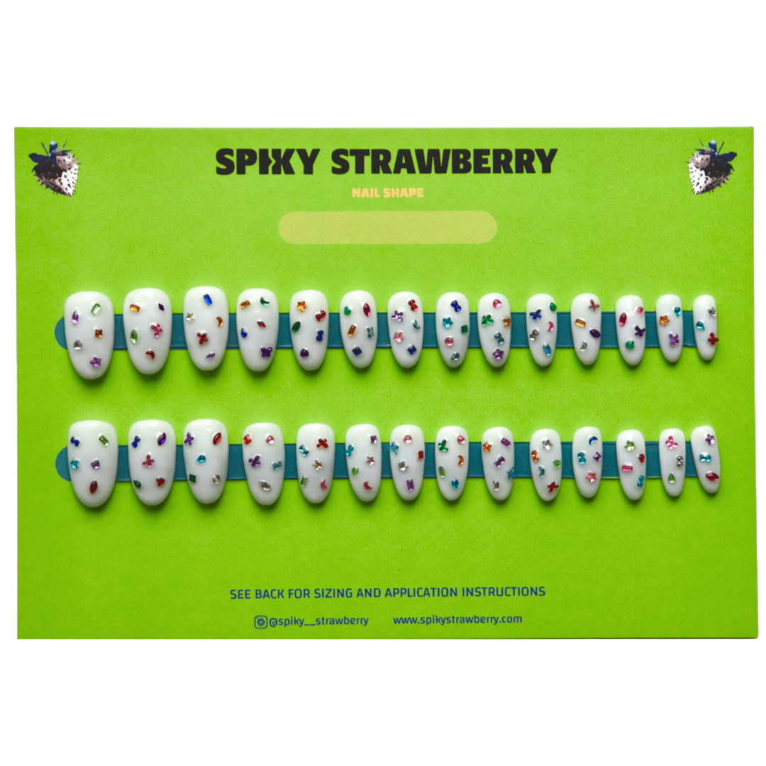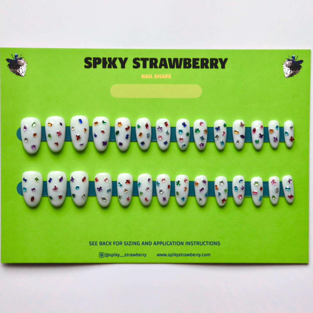 Spiky Strawberry™ Candy Crush ready to wear sizing kit includes two of every nail size, painted and prepped for instant application. Perfect for anyone who wants to find their fit but don't want to wait to get their hands on some nails!