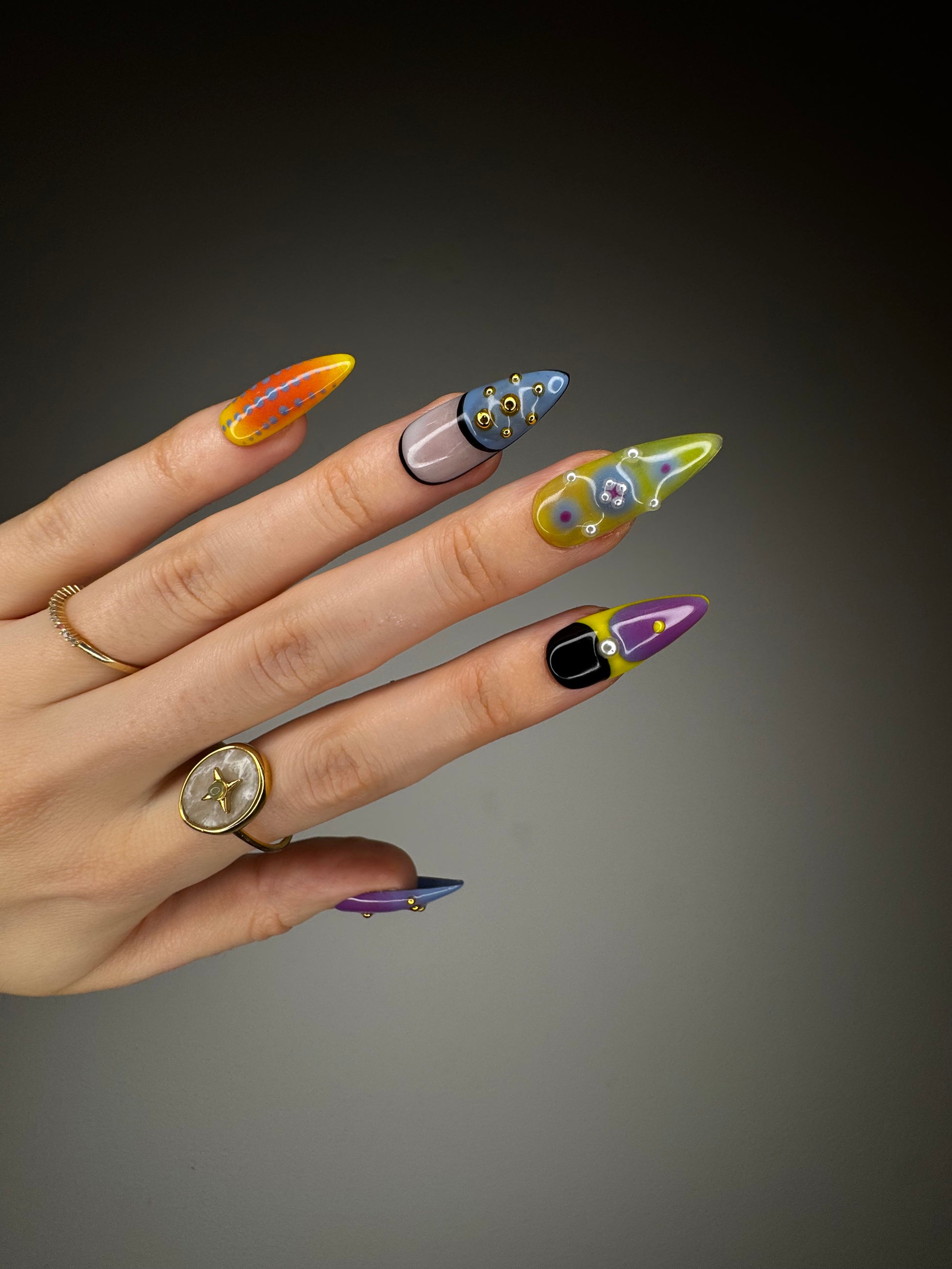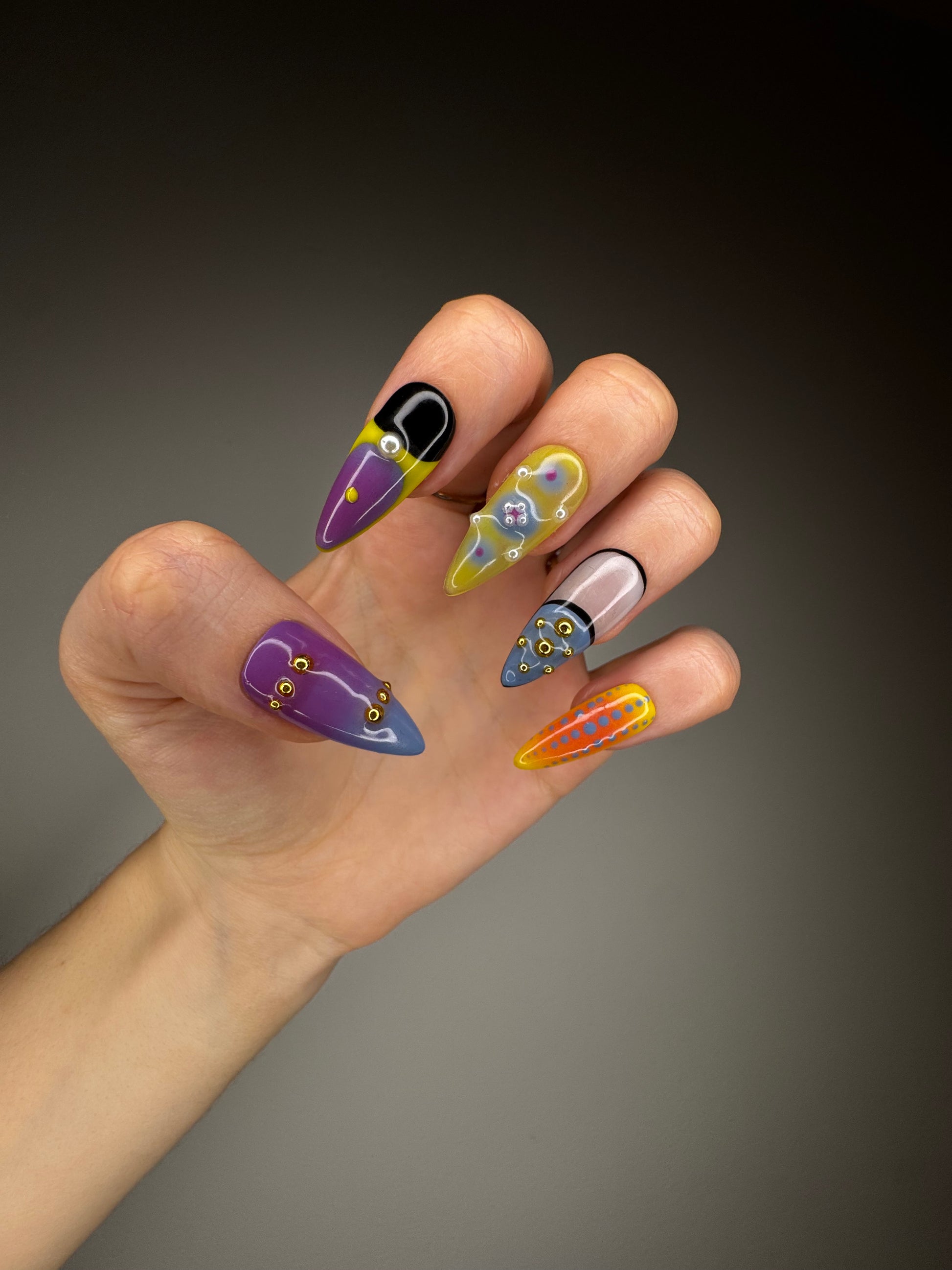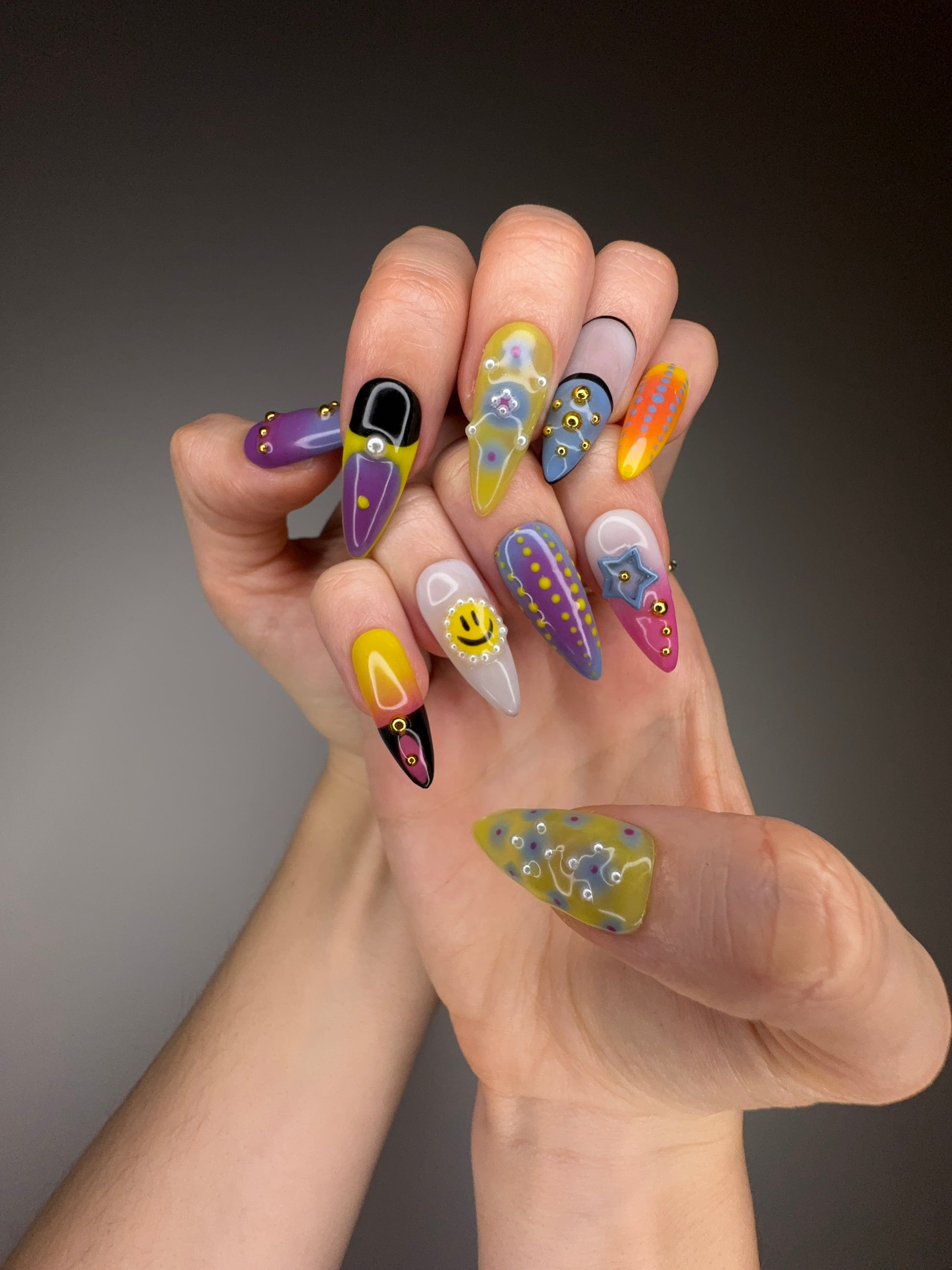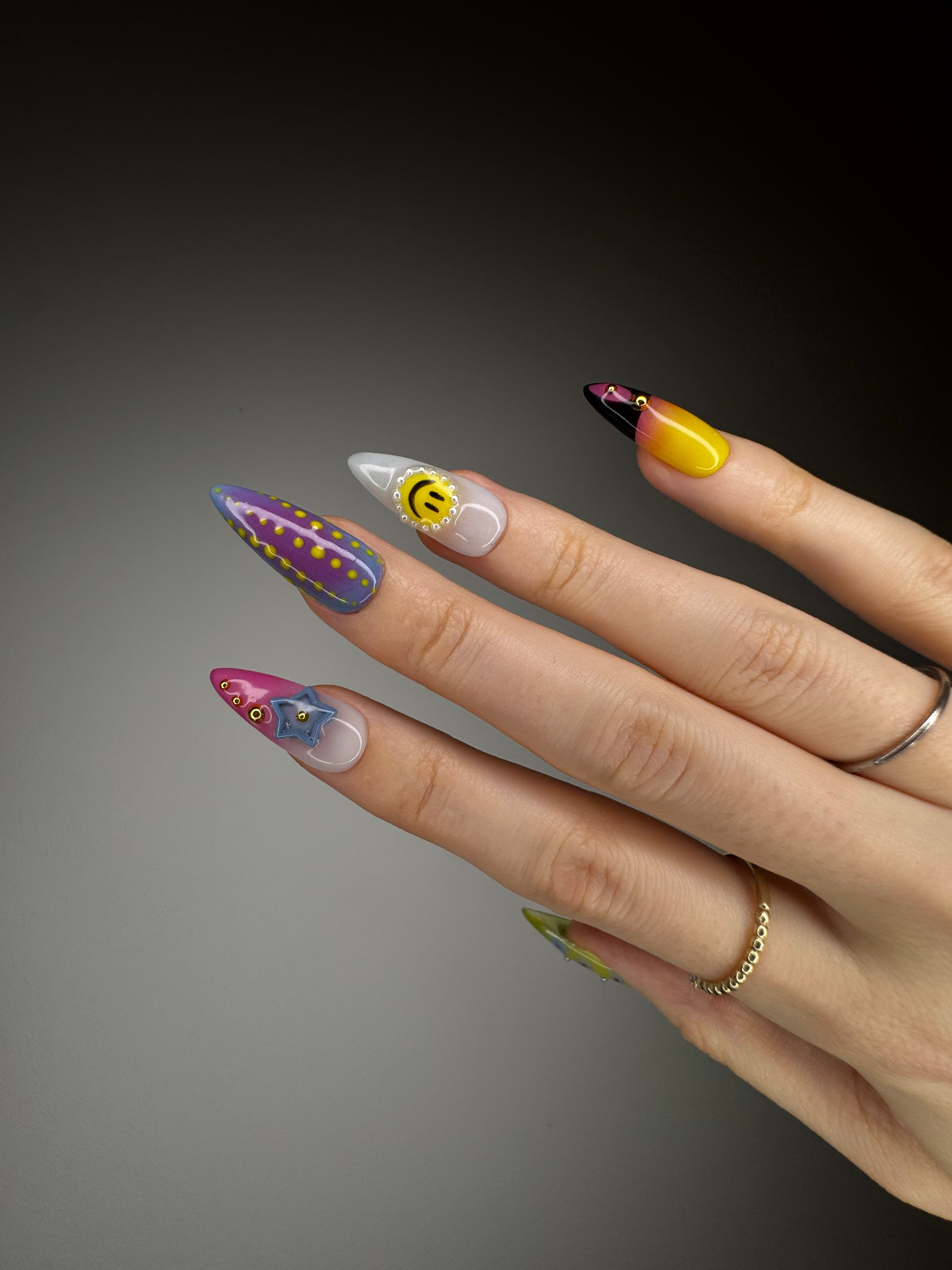 The Spiky Strawberry™ Smile Set is inspired by playful, retro graphics and vibrant ombre effects. Smiley faces, stars, and abstract shapes give each nail a bold, expressive style.