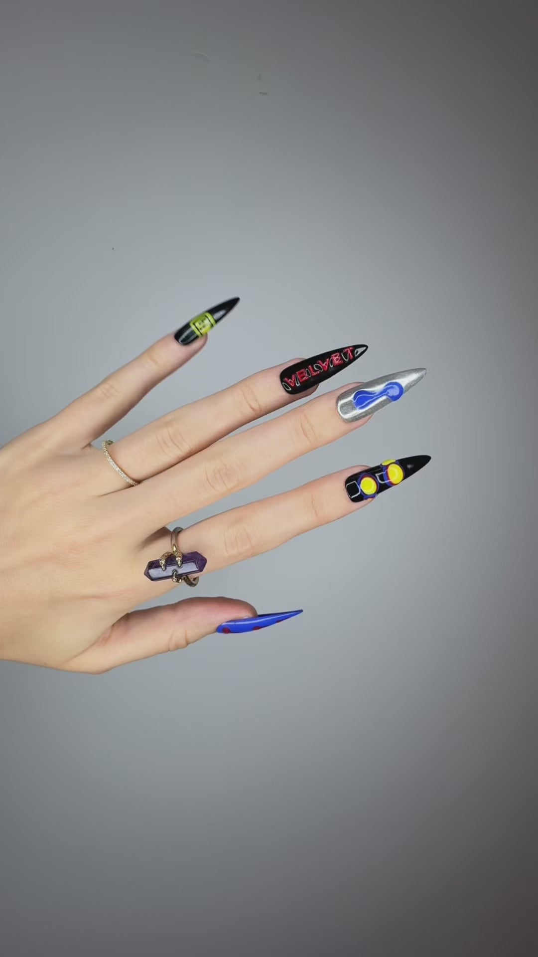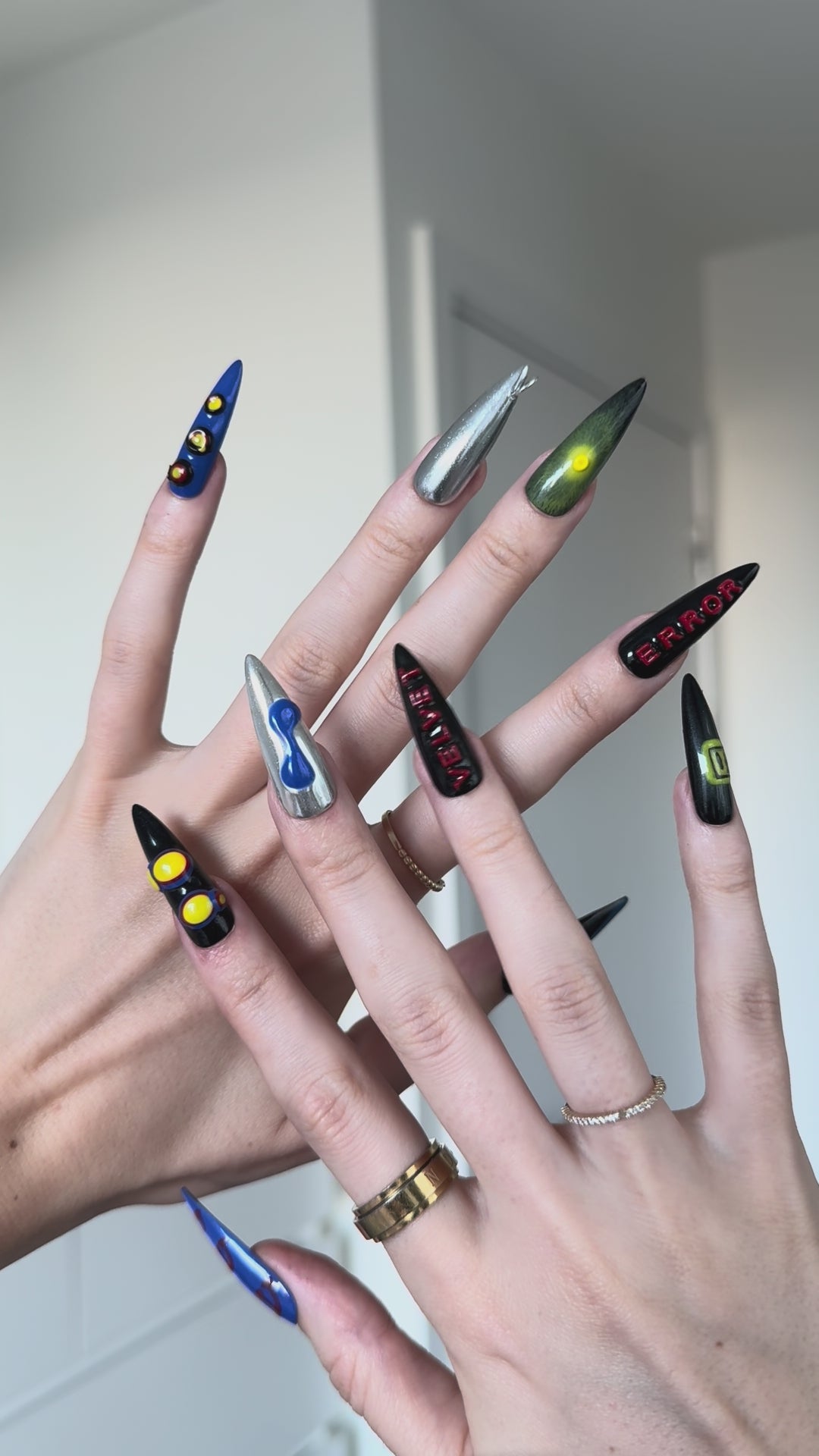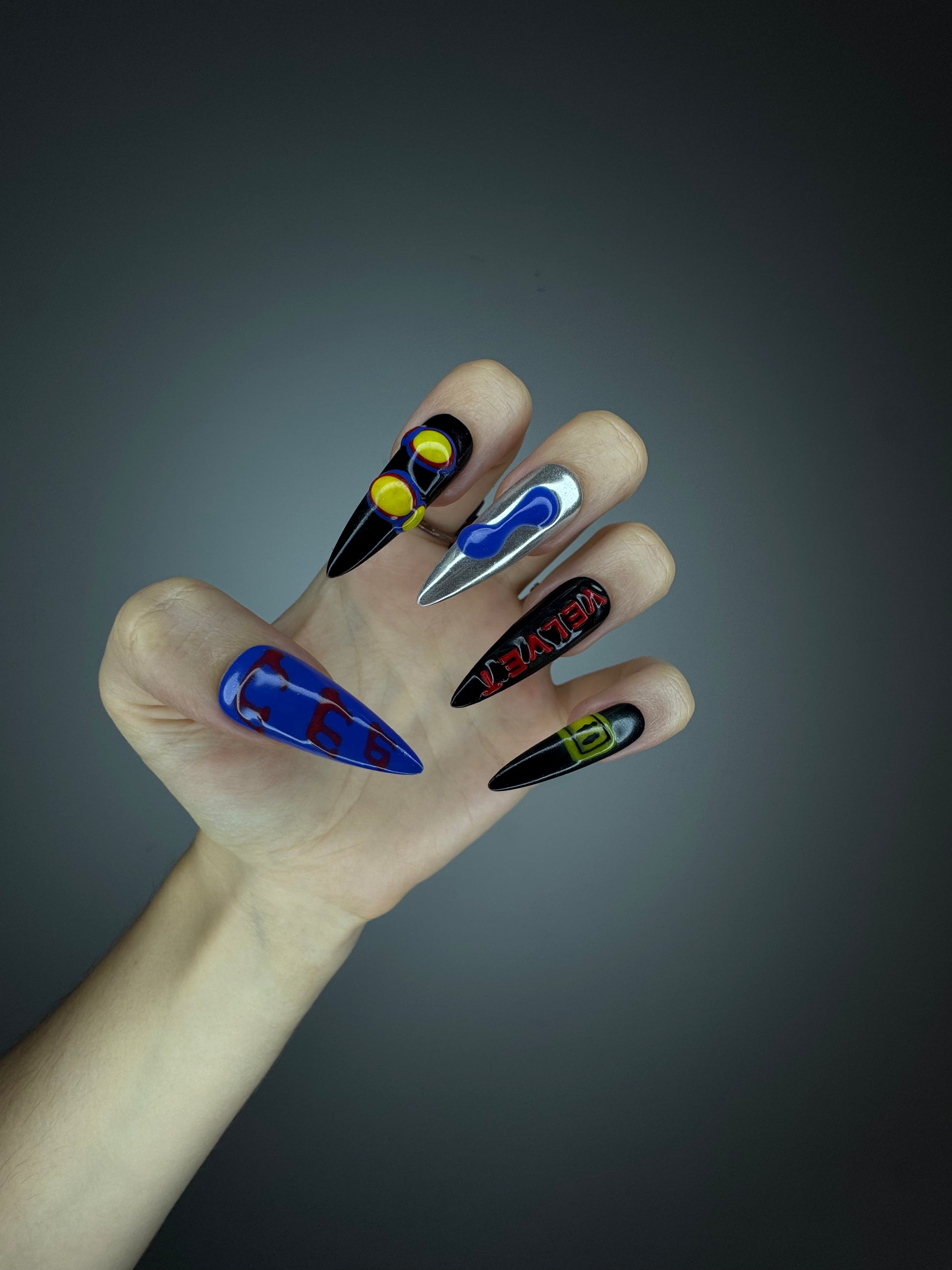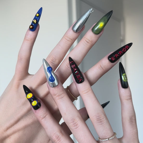 Spiky Strawberry™ Techno set is inspired by underground techno clubs. Bold chrome, electric blue, and acidic neon details clash with shiny finishes, 3D shapes, and sharp typography like "ERROR" and "VELVET."