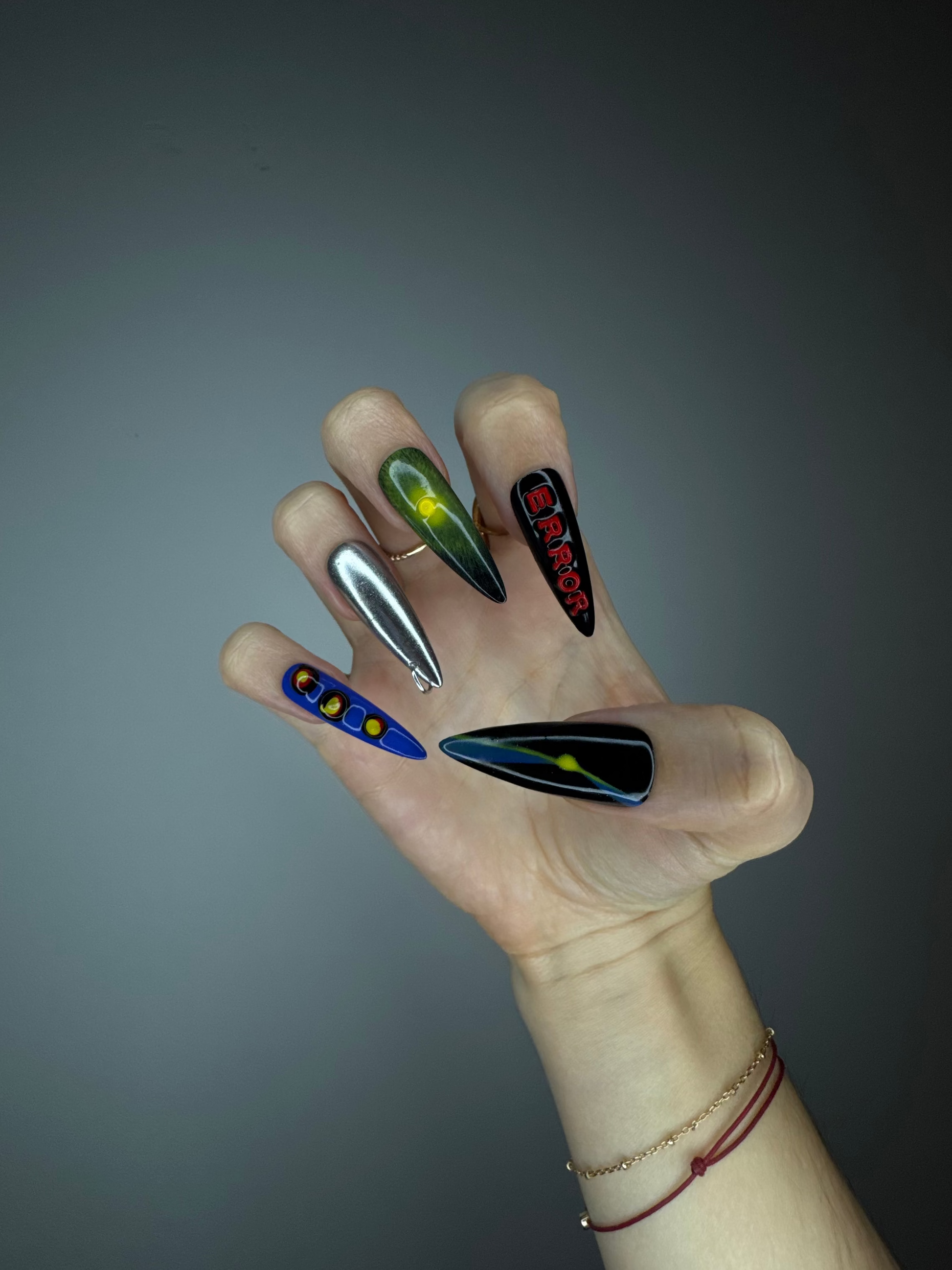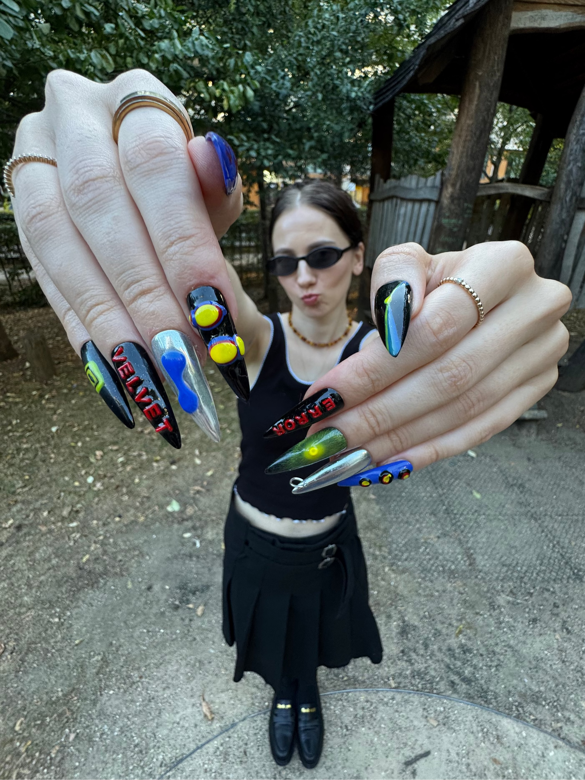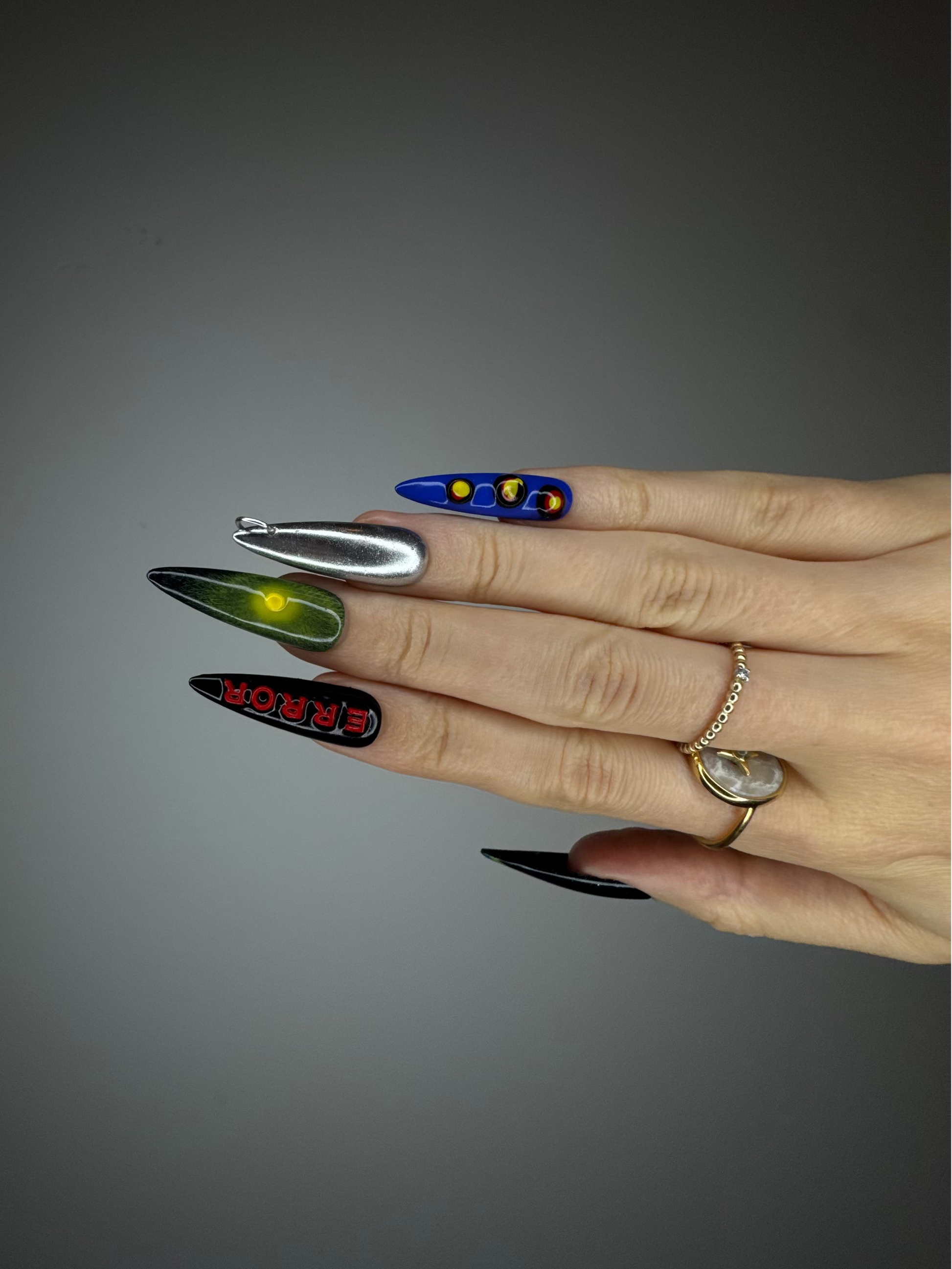 Spiky Strawberry™ Techno set is inspired by underground techno clubs. Bold chrome, electric blue, and acidic neon details clash with shiny finishes, 3D shapes, and sharp typography like "ERROR" and "VELVET."